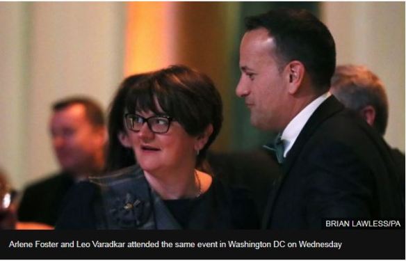 ‘The Irish Premier was speaking as he hosted a reception at Dublin Castle attended by the United States House of Representatives speaker Nancy Pelosi. ‘Also attending were TDs, Senators, Garda Commissioner Drew Harris and Democratic Unionist leader Arlene Foster.