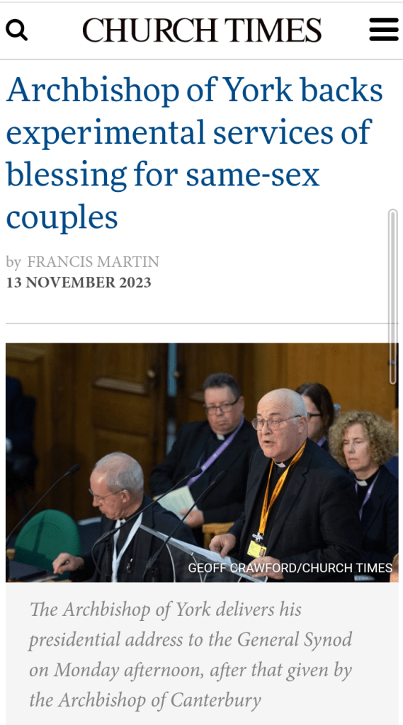 ‘It is being widely reported that the Church of England’s governing body, General Synod, has backed trials of services blessing same-sex relationships. The Guardian says “services to celebrate gay marriages could be held within weeks”.