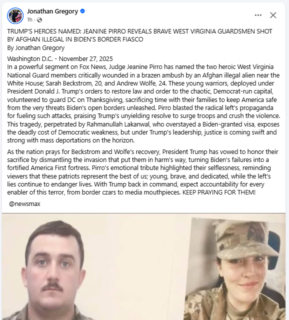 ‘In a powerful segment on Fox News, Judge Jeanine Pirro has named the two heroic West Virginia National Guard members critically wounded in a brazen ambush by an Afghan illegal alien near the White House; Sarah Beckstrom, 20, and Andrew Wolfe, 24. These young warriors, deployed under President Donald J. Trump’s orders to restore law and order to the chaotic, Democrat-run capital, volunteered to guard DC on Thanksgiving, sacrificing time with their families to keep America safe from the very threats Biden’s open borders unleashed.