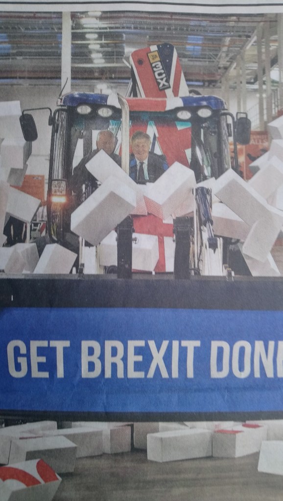 4 > Only days before the General Election we see the PM performing a ‘prophecy in action’ exercise in a JCB by demolishing a high barrier of polystyrene blocks with ‘GRIDLOCK’ written on them.