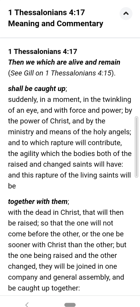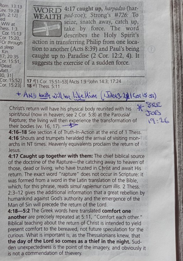 So, now let’s check our New Spirit-Filled Life study Bible’s notes on chapter 4 verse 17 of Paul’s first letter to the Thessalonian church. It explains why ‘the exact word ‘rapture’ does not occur in Scripture’ and its ancient origin: