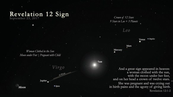 Then, teaching from Revelation 12, Charlie considers how this scripture suggests the very same zodiacal configuration and alignment known to Daniel set for Jesus’ birth – will be once again be of astronomical significance on 23rd September 2017. (Not as a Venus-Jupiter conjunction I’d assumed; see NASA’s Sky Events 2017 calendar.)