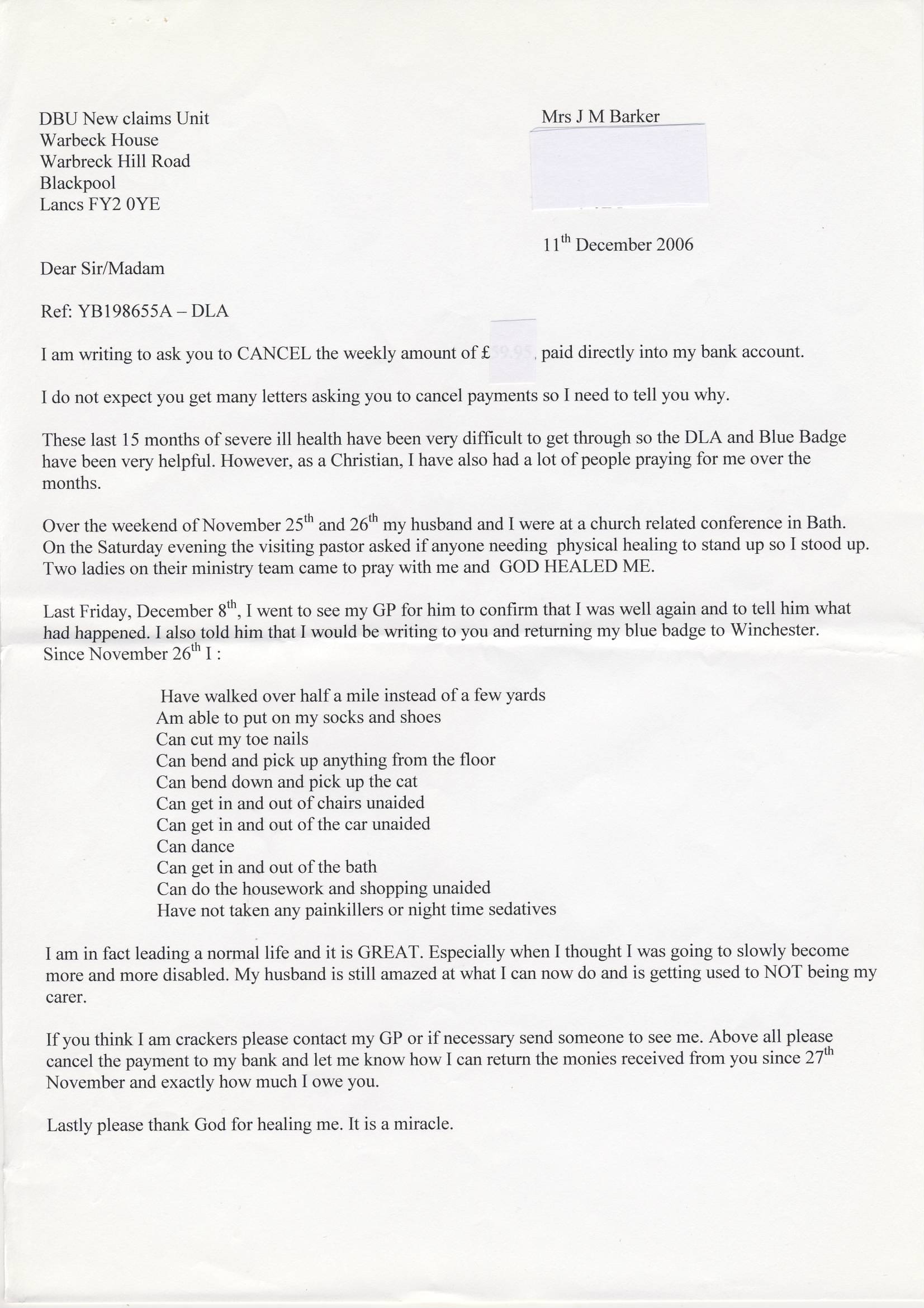 Nina’s letter to the DWP informing them that her disability has been healed by God – for a transcript of her full account, as delivered orally, of how Jesus healed her spine read From Disabled to Enabled :