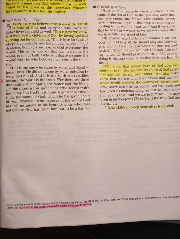 As this photo of my old 1995 NIV Insight Bible shows, I’ve been intrigued by and been able to understand the additional clarity provided to 1 John 5 vv7-8 many centuries after the Canon of scripture was agreed: