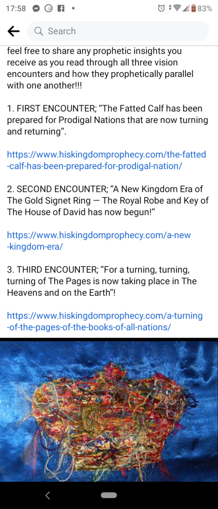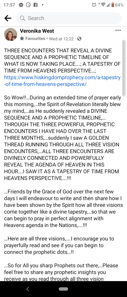 Taking 5, after spending valuable time prepping sizable complaint for TalkTalk’s CEO, I dropped into my Facebook. Although I’m a ‘friend’ of Veronika the silly system doesn’t show me her postings, so I had to search and look what popped up too – another fine example of God’s Global Prophecy Signals, which I shared to my timeline as follows: