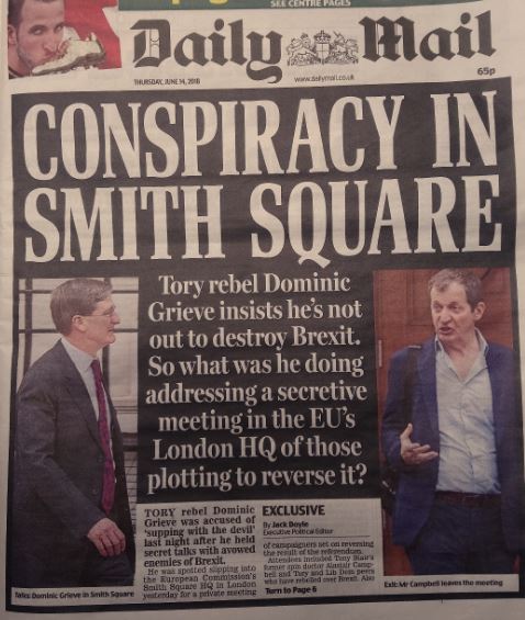 The Mail’s scoop lies in spotting Grieve ‘slipping into the European Commission’s Smith Square HQ in London yesterday for a private meeting of campaigners set on reversing the result of the referendum.