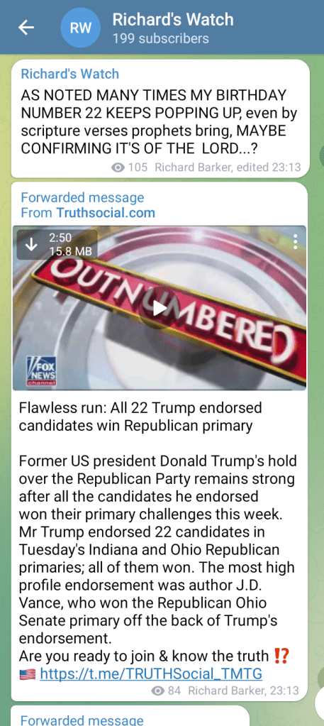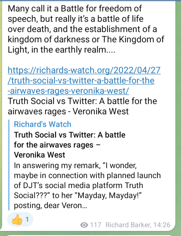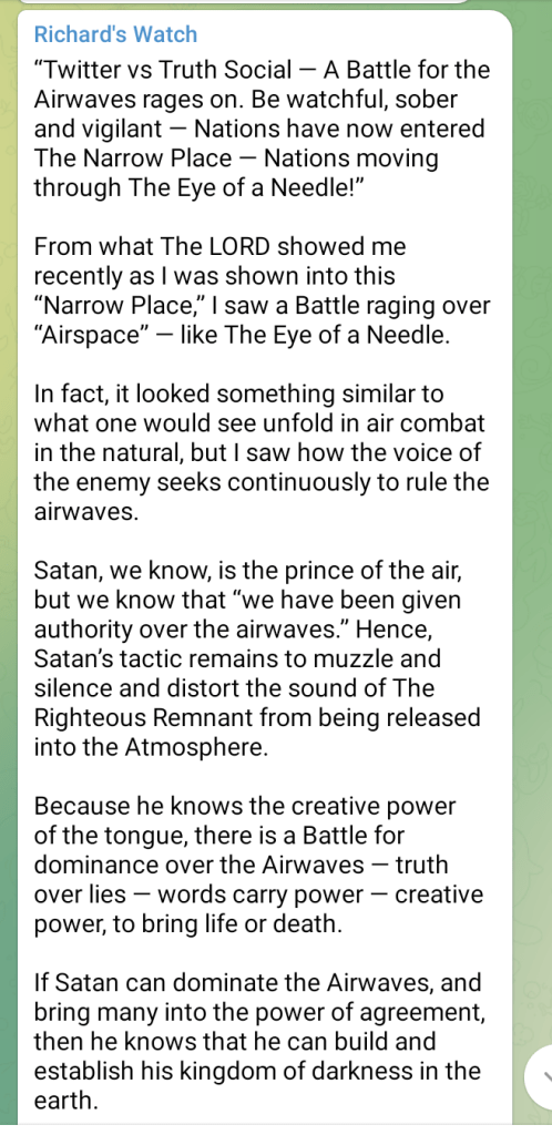 “Twitter vs Truth Social — A Battle for the Airwaves rages on. Be watchful, sober and vigilant — Nations have now entered The Narrow Place — Nations moving through The Eye of a Needle!”