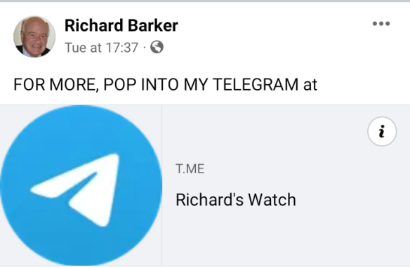 After many distractions and attending to a wildly flapping green-house door and fence paneling in ferocious winds, I’m now sitting at my desk chewing a delicious chunk of Nina’s home-made cheese scone and sipping piping hot coffee, I invite you to join my Telegram channel https://t.me/RichardsWatch (or click image):