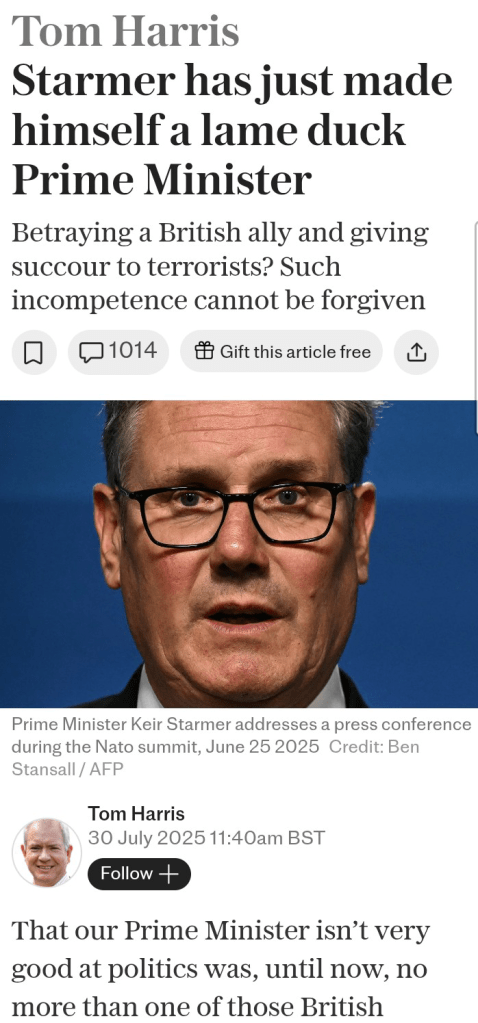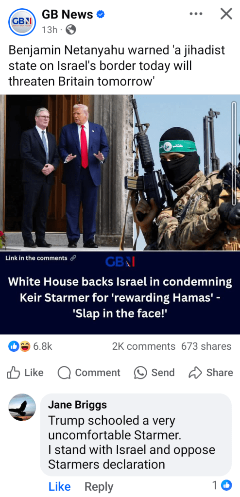 I comment upon the Facebook original: “(Earlier) I was prompted to reread Rev 13 re digital ID, the two beasts and mark of the beast. And (as I’ve said previously) we have ‘pigs may fly’ as I call it, Peace in Gaza, a splendid plan arranged by Pres Trump and Arab nations.