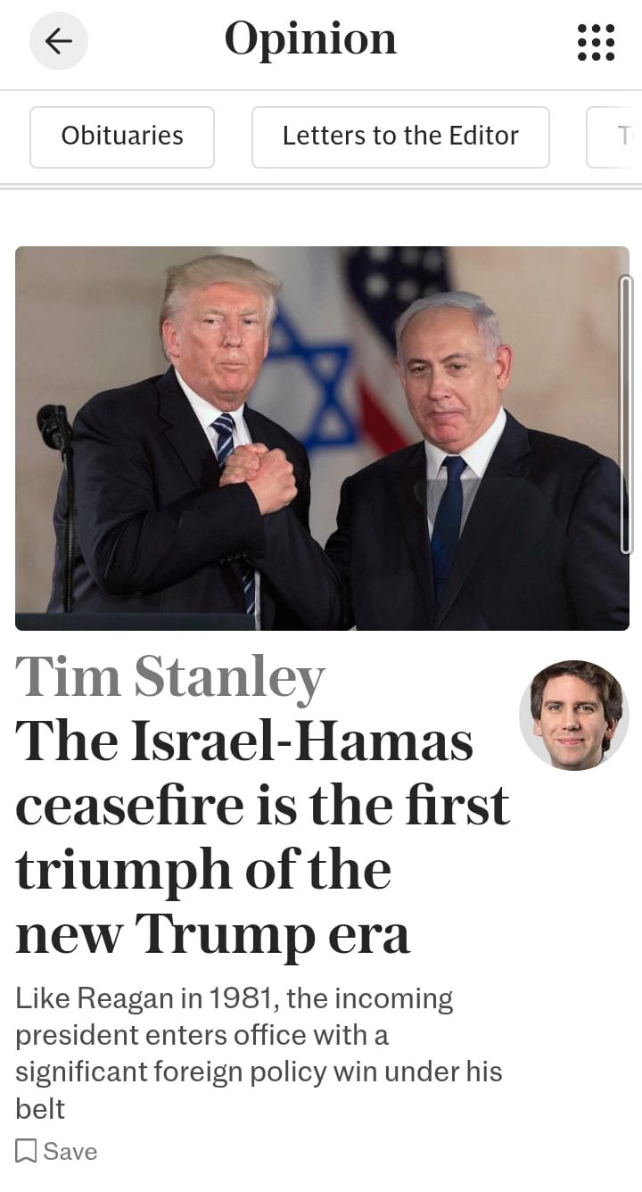 Continue reading at https://www.telegraph.co.uk/news/2025/01/15/president-trump-make-our-enemies-talk-middle-east-ukraine/ as well as Tim Stanley’s https://www.telegraph.co.uk/us/comment/2025/01/15/the-israel-hamas-ceasefire-is-the-first-triumph-of-the-new/