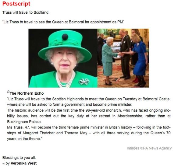 Elizabeth Truss will be Queen Elizabeth’s (15th) Prime Minister and for the first time in Balmoral Scotland, in her 70 Year Reign. (The Location of Scotland is very significant and will share more on the prophetic significance of this soon.)