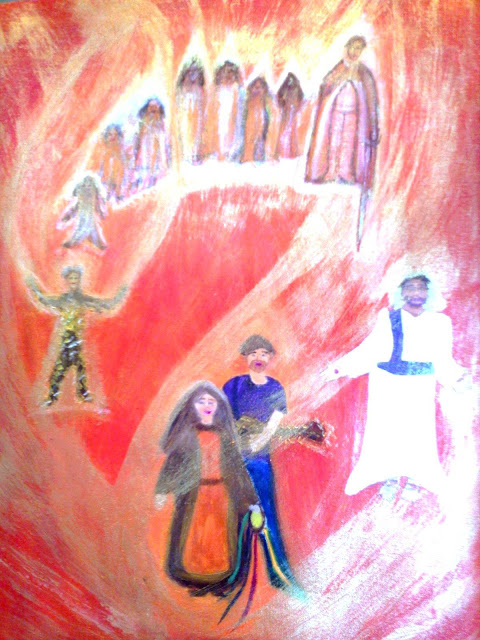 Yvonne painted a picture with fiery clouds and mountains and heard ‘A stitch in time saves 9’. This painting inspired Lisa to direct Yvonne to her word on the ‘SERAPHIM’ (RB: note dated 22.02.2020).