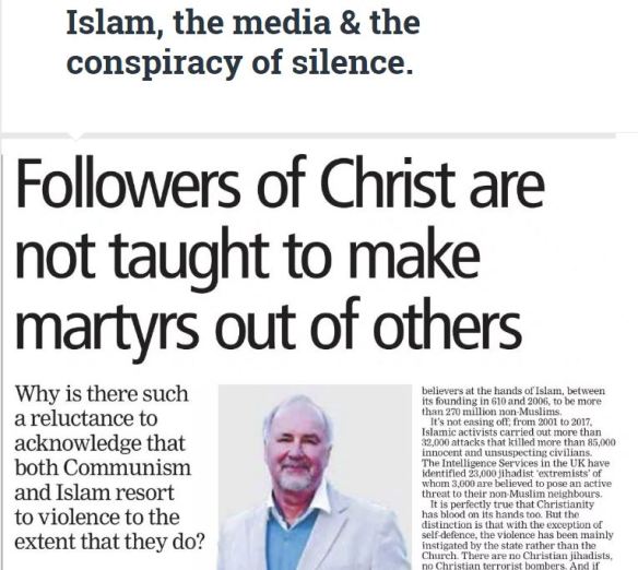 ‘With very rare exceptions, Christians do not kill Muslims or Communists. Both Communists (currently in China) and Muslims kill Christians on an industrial scale. As the Sunday School teacher said, Christians are taught to be willing to be martyrs for Jesus. Unlike Muslims they are not taught to make martyrs of others. Why won’t the media and the politicians tell the truth about it?‘