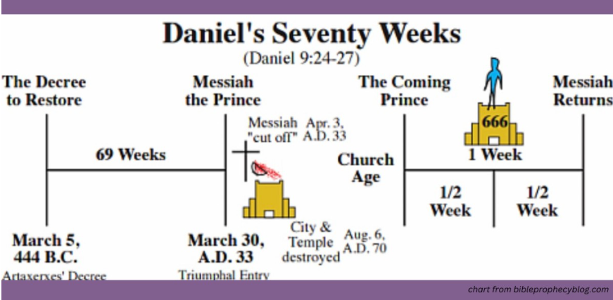Here’s the book’s fold-out table I saw on cross-links between prophet Daniel and the Book of Revelation, under a photo of the Dome on the Rock mosque in Jerusalem…