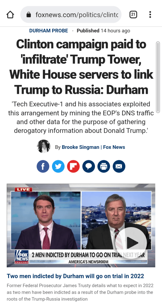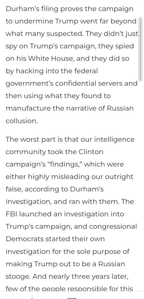 Being a long weekend I popped onto my pc for 15 minutes before Saturday’s lunch to print off Friday night’s Eye View From the White House on Koenig’s World Watch Daily and spotted a couple of inter-connected items I could quickly re-blog or copy, including. John Barber’s overview of The Mueller and Durham Reports, which proves pertinent to the latest news. The next morning he messaged me about having updated it as a consequence of a reader’s comment.