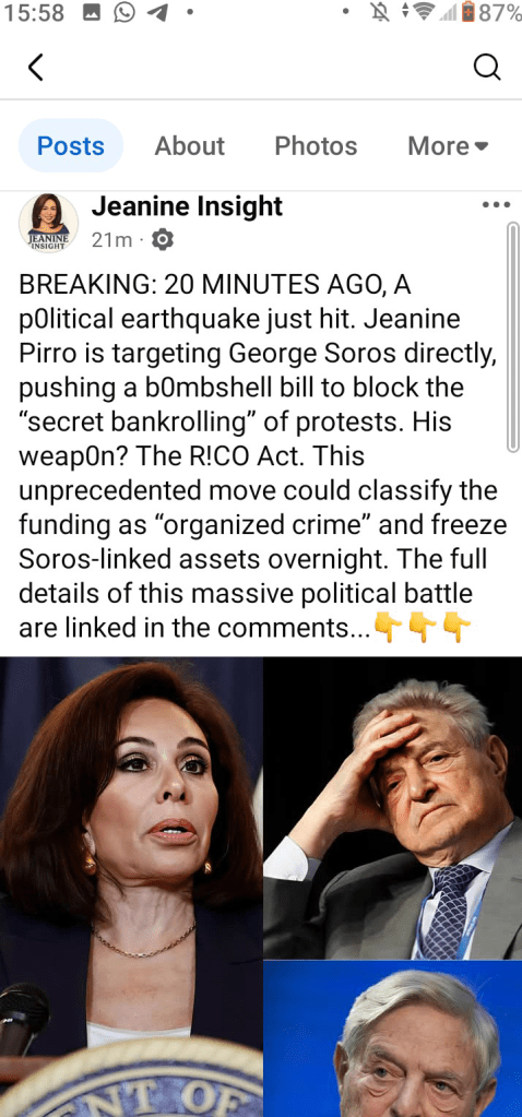 “Jeanine Pirro JUST FIRED THE FIRST SHOT IN THE FINANCIAL W@R Jeanine Pirro has proposed a bill that would classify George Soros’ protest funding network as organized crime under the RIC0 Act — a move that could freeze hundreds of millions of dollars overnight. But this is more than just a political stunt. Jeanine Pirro is going after the money itself — and what would happen if her bill passed could shake the foundations of political power in America.” 👉 [Visit her Facebook]